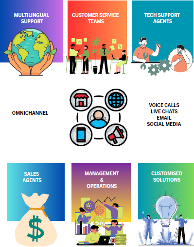 Tell us a bit about your business goals and we’ll guide you to the right solution: ● Multilingual Support ● Customer Service Teams ● Tech Support Agents ● Sales & Retention Teams ● Management & QA Solutions ● Custom BPO Strategies